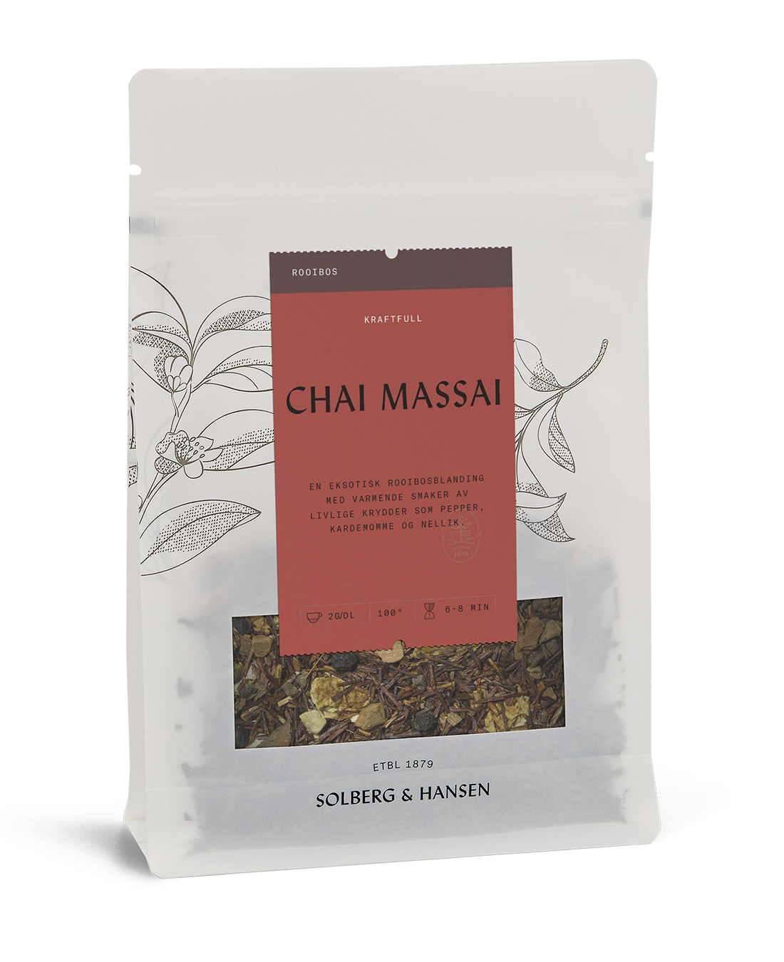 Rooibos er nålene fra en busk som vokser vilt i Sør-Afrika. Rooibos er en naturlig koffeinfri og blir ikke bitter om den brygges lenge. Rooibos chai massai inneholder rooibos, kanel, ingefær og kardemomme.